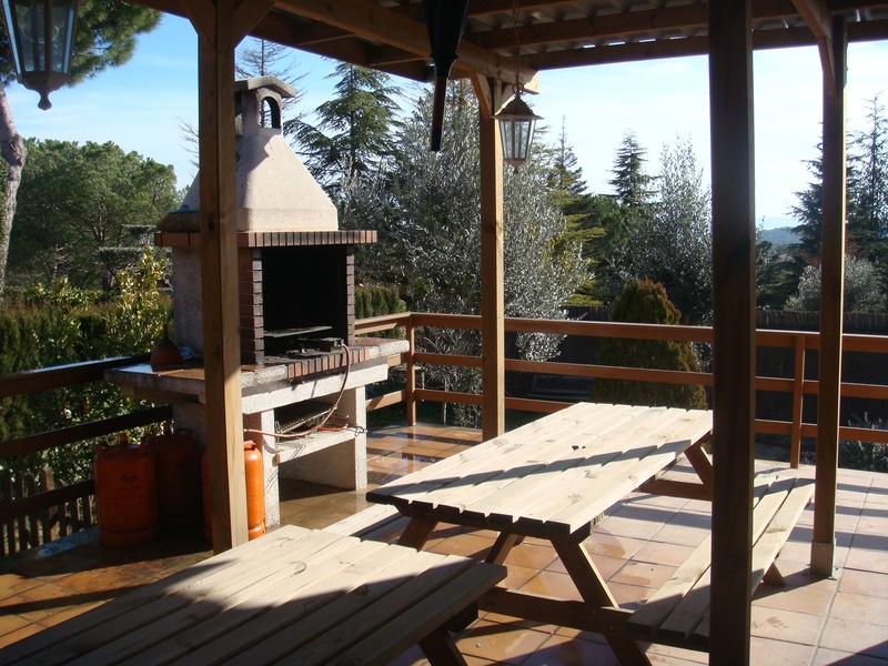Amplia zona de jardín, con piscina, árboles frutales y zona de barbacoa cubierta con acceso directo a la cocina.