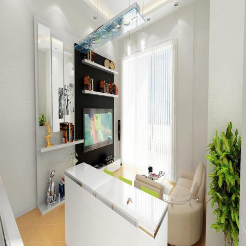 Студия состоит из гостиной, совмещенной с кухней открытого типа (американская кухня). Есть также ванная комната и балкон.