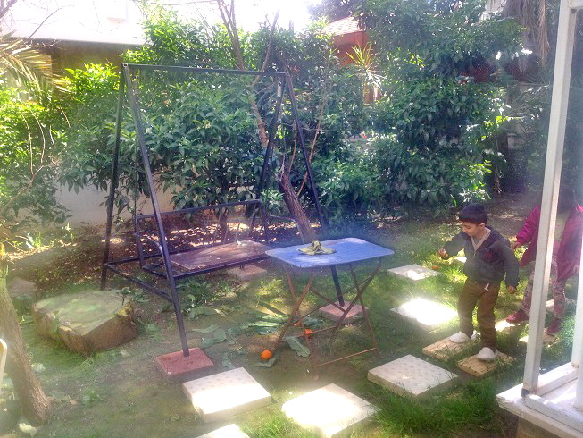 Квартира на первом входном этаже, отдельный вход, большой участок земли, на участке из камня выложен мангал, детские качели, апельсиновые деревья и абрикосовое дерево.