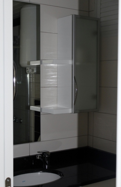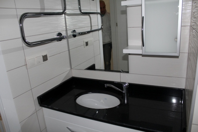 - встроенный кухонный гарнитур белого цвета с гранитной столешницей