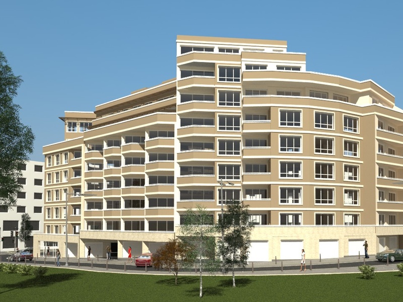 Здание имеет подвал, цокольный этаж и восемь этажей в трех отдельных входов с лифтами. Подвале и на первом этаже будут и гаражи и два магазина на первом этаже. В апартаментах есть одна или две спальни и студий.