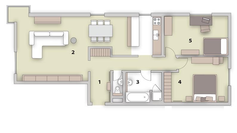Интерьер квартиры предлагает прихожую, гостиную с открытого типа кухней, обеденной зоной и прямым выходом на балкон, далее 2 спальни, ванную комнату и гостевой туалет.