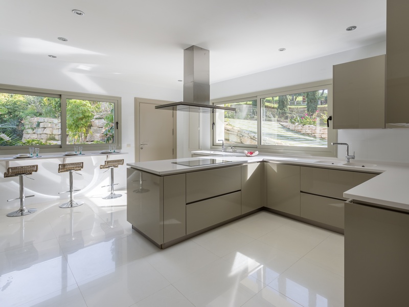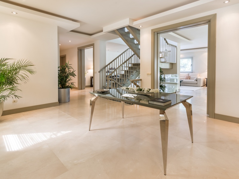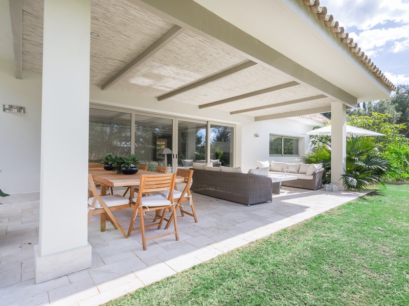 Excellent villa in Los Monteros based on white Spanish modern style with ceramic tile Arabic roof. Very close to the sea, frontline golf. Entrance hall, five bedrooms with en suite bathrooms, guest toilet, main hall, lounge, dining room, living room, kitchen, porch, all of them very large. Onyx fireplace lounge and dining room. Aged marble flooring in porch and gardens. Marble floors on ground and first floors except in bedrooms. 4 car garage. Room facilities. Storage rooms of over 100 m2. Oversized pool with waterfall emerald tile, lighting color. Ideal for golf enthusiasts. Very calm tranquil area with direct access to the golf courses and close to the sea.