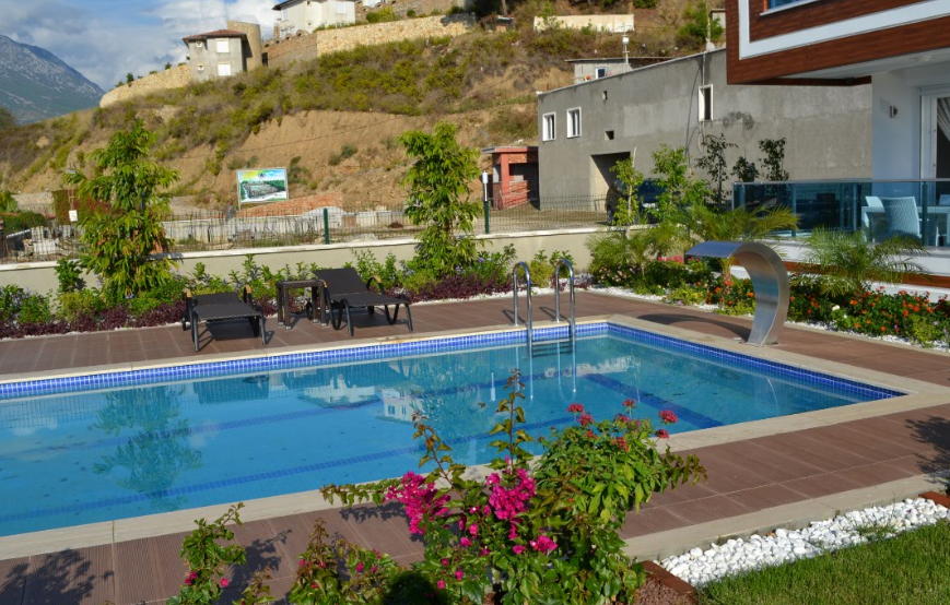 Панорамные двери выходят к бассейну размером 30 м² с террасой с шезлонгами. Стильный лаунж возле бассейна идеально подходит как для повседневного обеда, так и для романтического ужина, где можно разместиться, попивая коктейль, вдыхая воздух Таврийских гор.