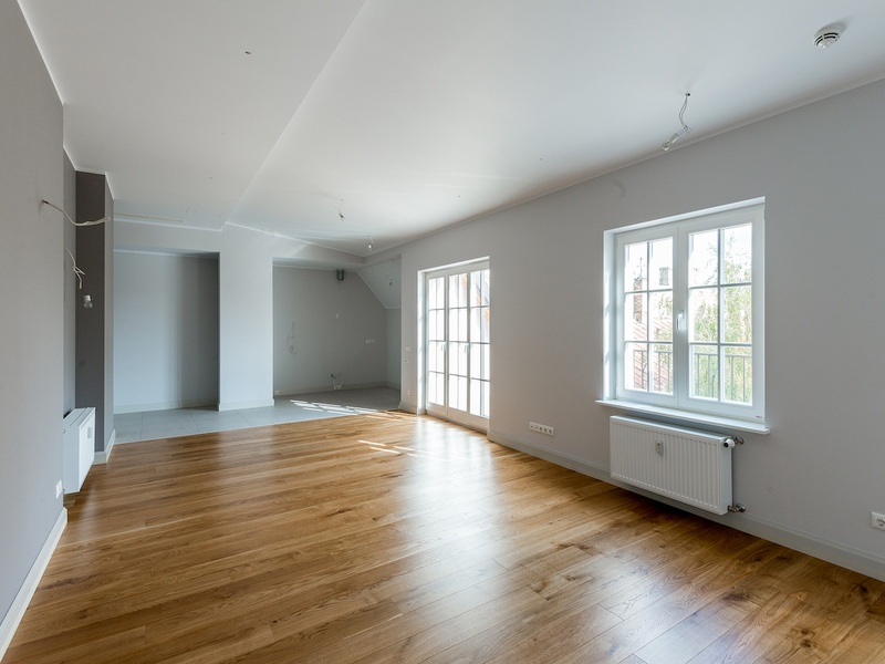 В квартире просторная гостиная комната объединена с эоной кухни (42,5 m2).