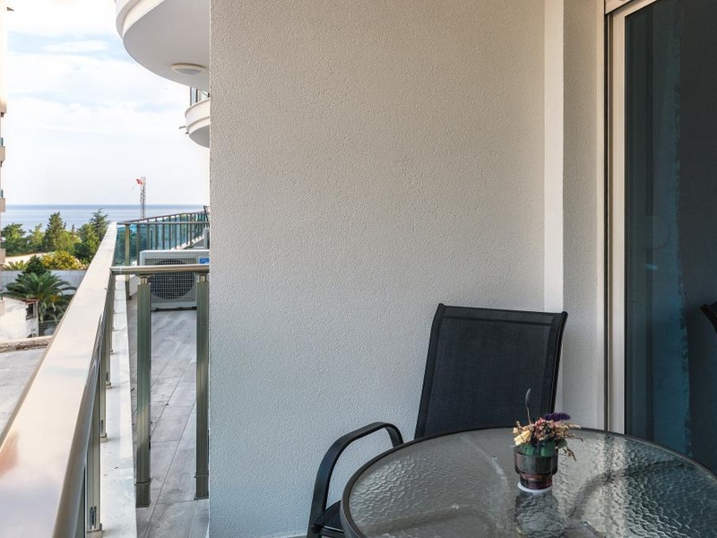 Квартира состоит из просторной гостиной с кухней, ванной комнаты и большой террасы с видом на море и горы.