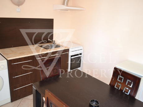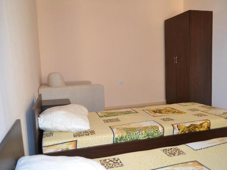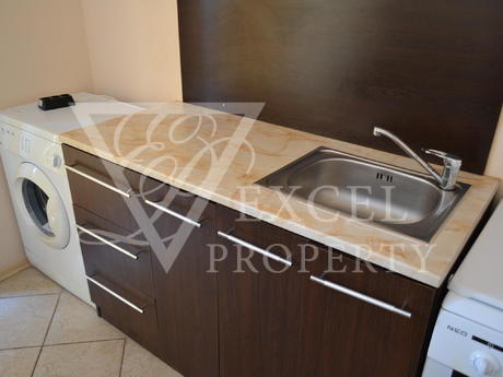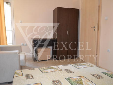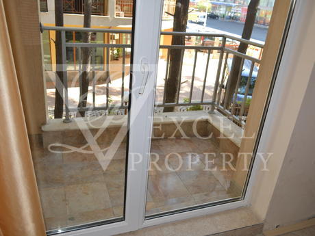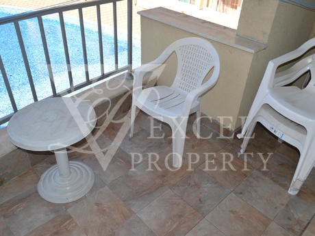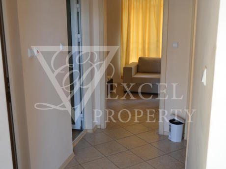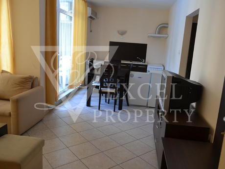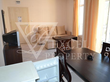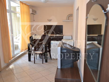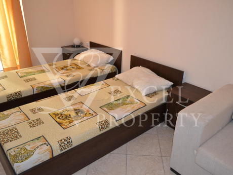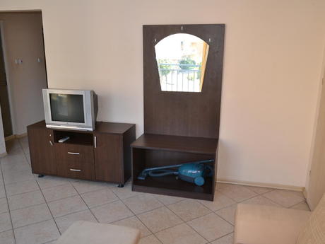 Она полностью меблирована и имеет просторную гостиную с диван-кровать, кресло, телевизор, небольшая кухня с духовкой, плита, вытяжка, стиральная, холодильник и обеденный стол с четырьмя стульями. В гостиной есть балкон к западной стороне и видом на бассейн. В спальне есть двуспальная кровать, шкаф, прикроватные тумбочки, туалетный столик. Во второй спальне есть две отдельные кровати с прикроватными тумбочками, креслом и шкафом. Существует еще один балкон, доступ из обеих спален. Кондиционеры во всех трех комнатах. Есть одна ванная комната и один туалет. Квартира предлагает комфортное проживание 6-7 человек, а расстояние до моря составляет около 500 метров. Младост супермаркет находится в 200 метрах от комплекса.