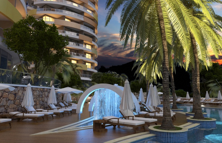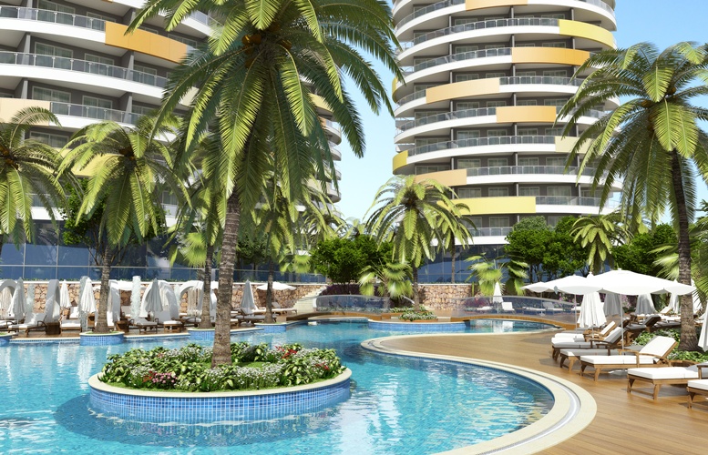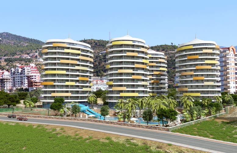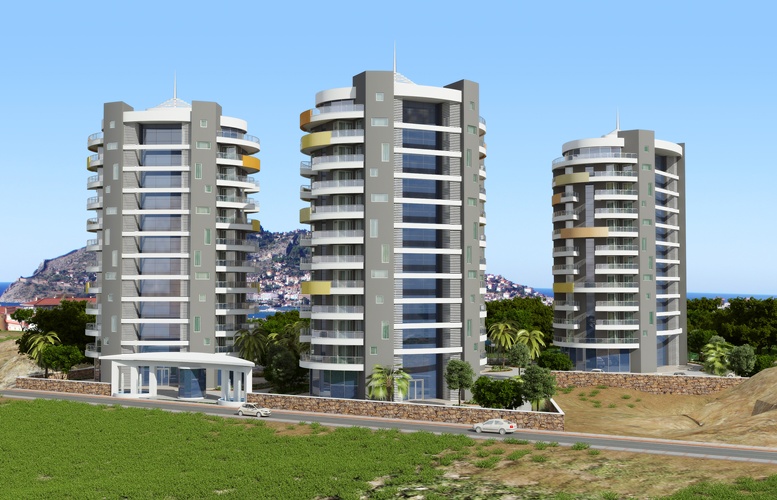 Проект, состоящий из четырех многоквартирных домов все оформления в современном стиле.Каждый блок состоит их 9 этажей, на этаже по 5 квартир, на территории комплекса находится большой сад, с тропическими деревьями, и цветами, захватывающий вид на Средиземное море, замок Алании и горы Таурус.