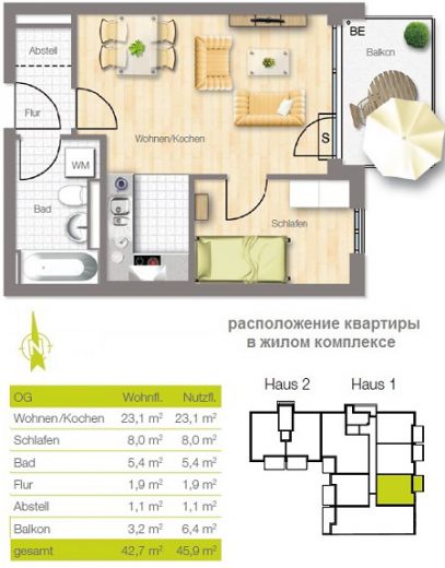 Квартира состоит из гостиной / кухни 23,1 м² , спальни 8 м², ванной 5,4 м² и балкона 6,4 м² (восточная сторона). Жилая /полезная площадь - 42,7 м²/ 45,9 м².