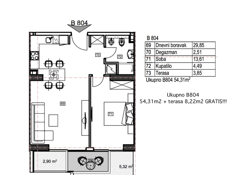 1-bedroom apartment number B804 in an exclusive multi-complex «Porto Budva» with a shopping center of 8000 sq.m and a SPA-center 3500 sq.m with a wide range of services, with indoor and outdoor pools!