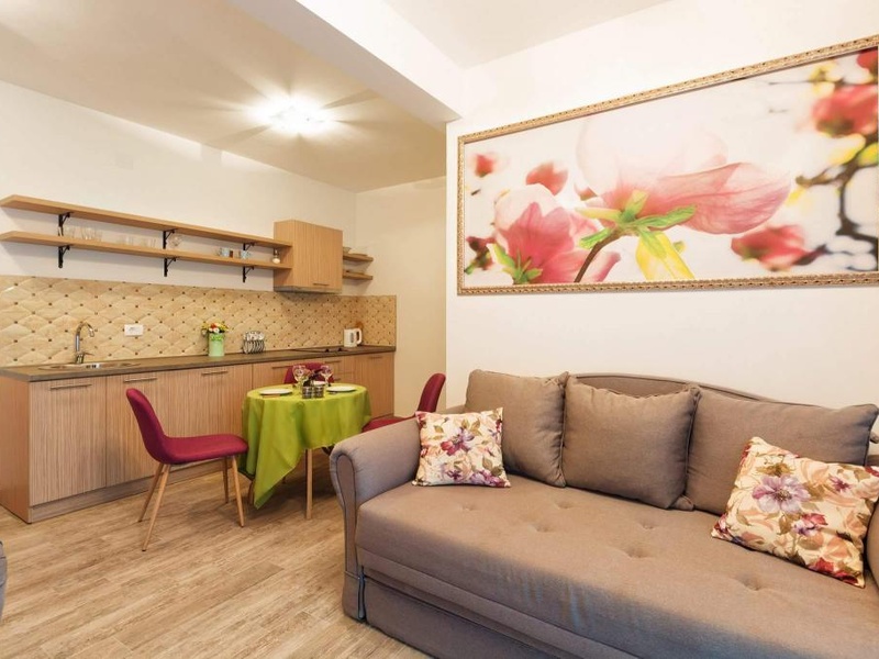 Квартира состоит из просторной гостиной с кухней, ванной комнаты и большой террасы с видом на море и горы.