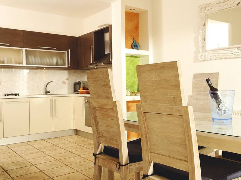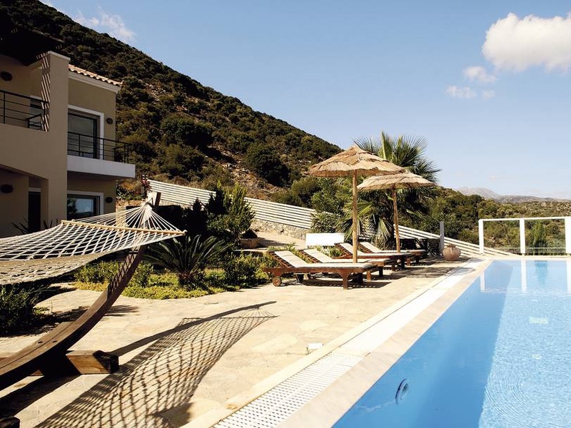 На террасе перед домом большой бассейн с удобными шезлонгами, соломенными зонтиками и гамаком.